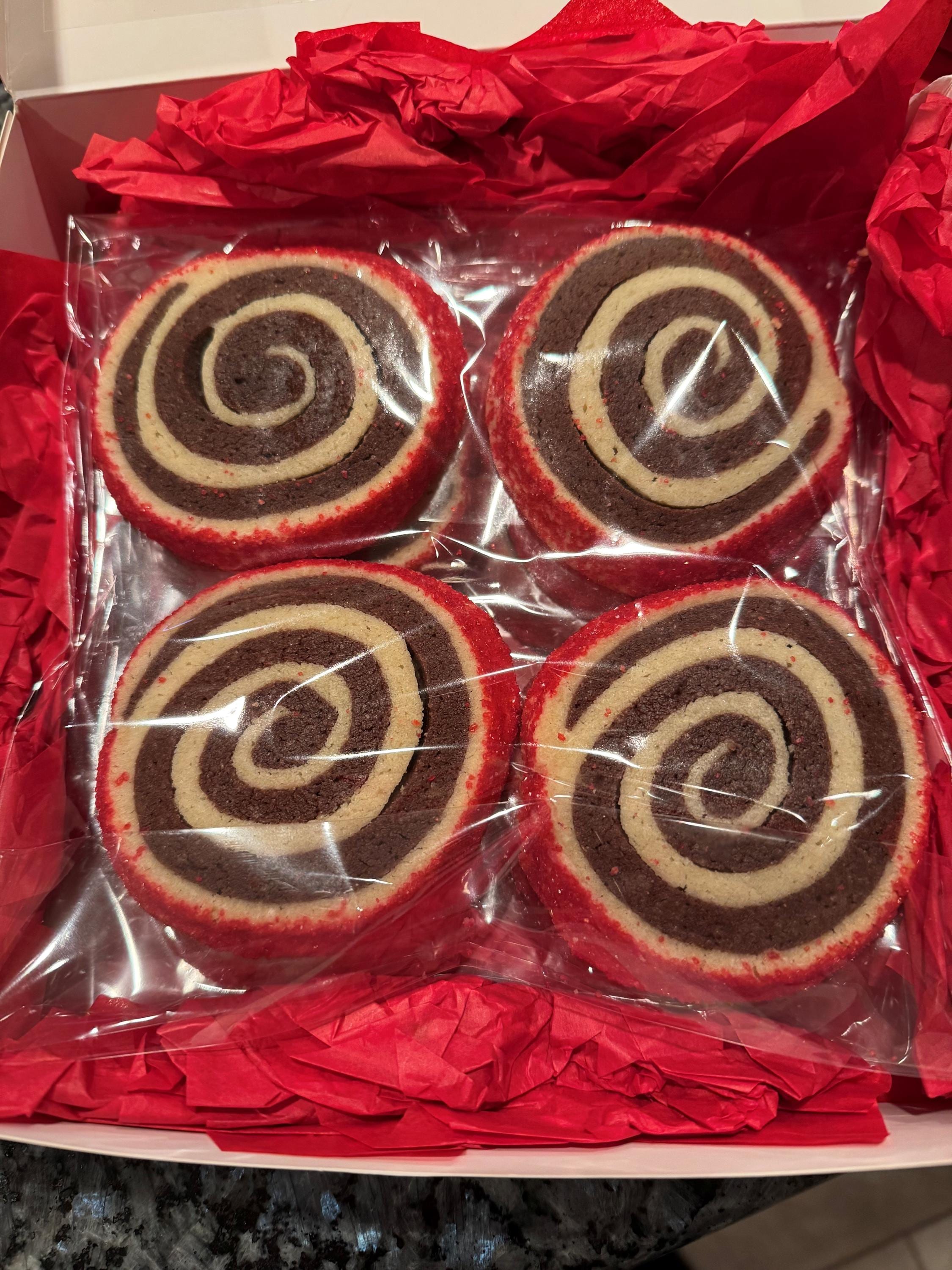 An old fashion pinwheel cookie that brings you back to nostalgic times. This cookie is a simple vanilla- chocolate “mild” flavor, not powerful.. with a soft texture in the middle and very slight crunch on end. Red or green sugar crystals are on the sides. Cookies are made by hand. We do not use machines to make our cookies, therefore, no two cookies are alike. If you are looking for a cookie with deep flavor, this is not it.
